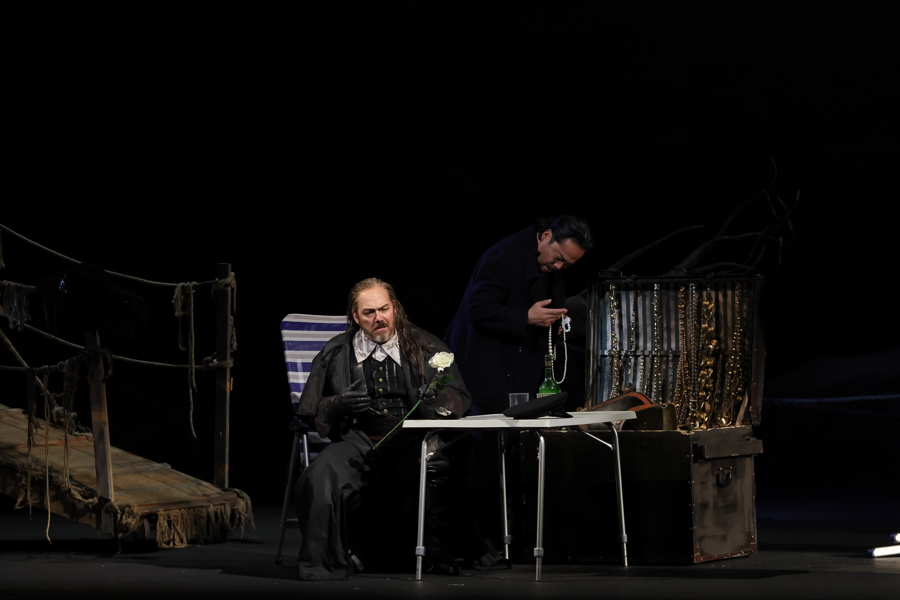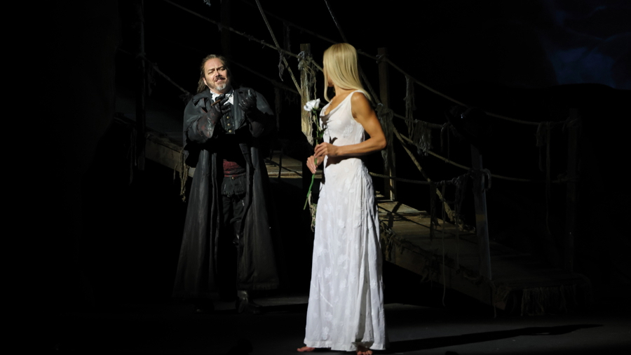 在音乐上,音乐总监弗拉基米尔·尤洛夫斯基掌控如同“隐形船长”,紧密推动乐团音流。海浪般的管弦色彩与人声交织,展现瓦格纳作品最初的成熟力量。饰演“荷兰人”的男中音克里斯托弗·马尔特曼,以浑厚而富有戏剧张力的嗓音描绘角色的孤独与抗争;女高音西妮德·坎贝尔·华莱士以明亮细腻而又深情温暖的音色,塑造了一个深情温暖的森塔;中国男低音李晓良则塑造了唯利是图的达兰德船长,他的登台让观众看见中国歌唱家在国际舞台的坚实足迹。