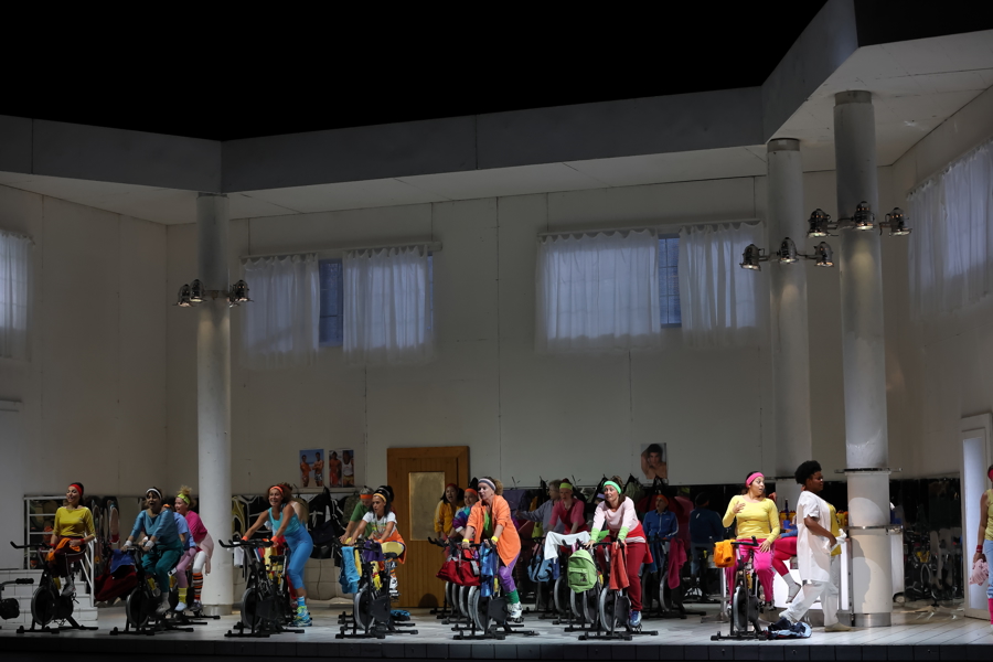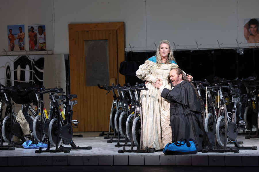 第一幕开场,舞台如同伦勃朗的油画,厚重而阴郁;而第二幕转场至现代健身房,森塔与姑娘们骑着动感单车登场,取代原本的纺车意象。这一现代化隐喻直击观众内心:在工业化与都市化的世界中,瓦格纳式的浪漫追求是否仍有价值?第三幕则化作船坞酒坊,光影投射下,森塔的剪影放大至覆盖全场,直至最后巨响一声的毁灭,令全体观众屏息凝神,直至最后爆发出雷动掌声。