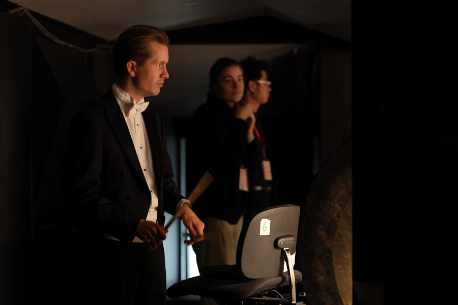 首演当晚,距离开场一小时,观众已涌入剧院前厅,流连于精心布置的“瓦格纳的房间”:墙上悬挂的肖像、谱架上摊开的《漂泊的荷兰人》总谱,甚至有人情不自禁弹奏起序曲的旋律。舞台上巴伐利亚国家歌剧院舞台技术总监丹尼尔·鲍尔带领观众探秘后台,“魔术般”的换景令歌剧爱好者和舞美学生惊叹不已;一楼的A+艺术空间里,总经理塞尔吉·多尼在艺术课堂分享《漂泊的荷兰人》背后的故事:这不仅是一段欧洲传说,更是年轻瓦格纳自身流亡与挣扎的写照。他的话让观众更深刻地理解作品。七点三十分,随着场铃提示音响起,乐团奏出狂风骤雨般的序曲,观众仿佛瞬间置身于惊涛骇浪的海面,迎接这部浪漫主义歌剧到来。